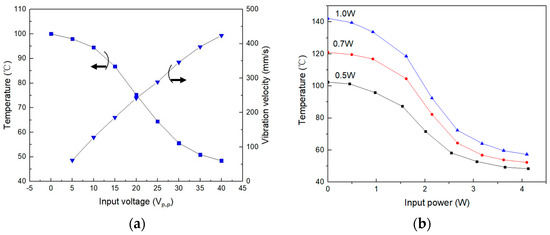 Figure 3. Measured cooling effects of the focused ultrasonic radiator for the heating element. (a) Measured surface temperature of the heating element and vibration velocity of the focused ultrasonic radiator versus the input voltage of the focused ultrasonic radiator. (b) Measured surface temperature of the heating element with varying heating power versus the input power of the focused ultrasonic radiator.
