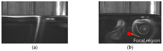 Figure 5. Flow field below the focused ultrasonic radiator working at 55.1 kHz. (a) Flow pattern without ultrasound. (b) Flow pattern with ultrasound.