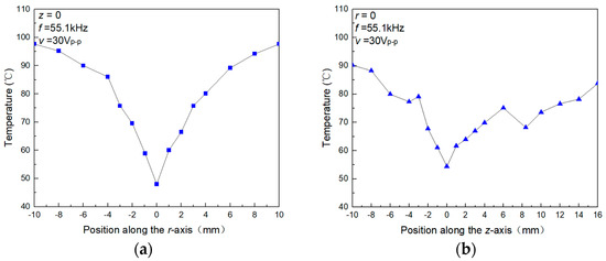 Figure 6. Surface temperature of the heating element at different positions in the ultrasonic field. (a) The central position of the sensor element is shifted along the r-axis at z = 0. (b) The central position of the sensor element is shifted along the z-axis at r = 0.