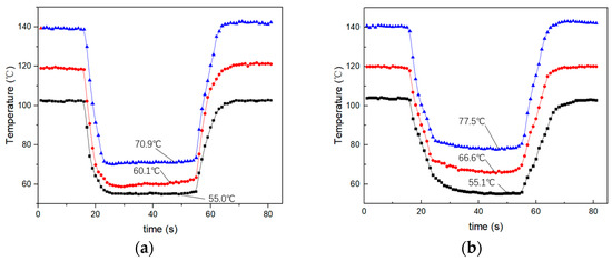 Figure 8. The cooling effect of the focused ultrasonic radiator and the centrifugal fan for a heating element with temperatures of 100 °C, 120 °C, and 140 °C. (a) The focused ultrasonic radiator. (b) The centrifugal fan.