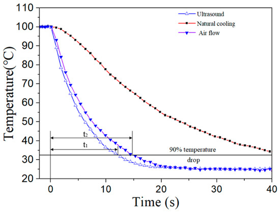 Figure 9 shows the measured cooling time of different cooling methods for the heating element once the power was turned off. The cooling time is defined as the time taken for the temperature of the heating element to drop by 90% of the total temperature drop from an initial temperature of 100 °C to a steady state temperature of 25 °C. In the experiments, the speed of air flow is 3.3 m/s and the input voltage of the focused ultrasonic radiator is 30Vp-p, which has a similar cooling effect. In Figure 9, t1 and t2 are the cooling time of the focused ultrasound radiator and fan, respectively. It is seen that the cooling time of the ultrasound is shorter than that of the fan. The cooling time of the ultrasound is about 75% that of the fan. This phenomenon is due to the different nature of the acoustic streaming fields generated by the fan and the focused ultrasound. The acoustic streaming field generated by the fan is unsteady, with a nature of intermittency [30], while that generated by the focused ultrasound is steady. A faster cooling response can reduce the duration during which the temperature rise is harmful to the working device.