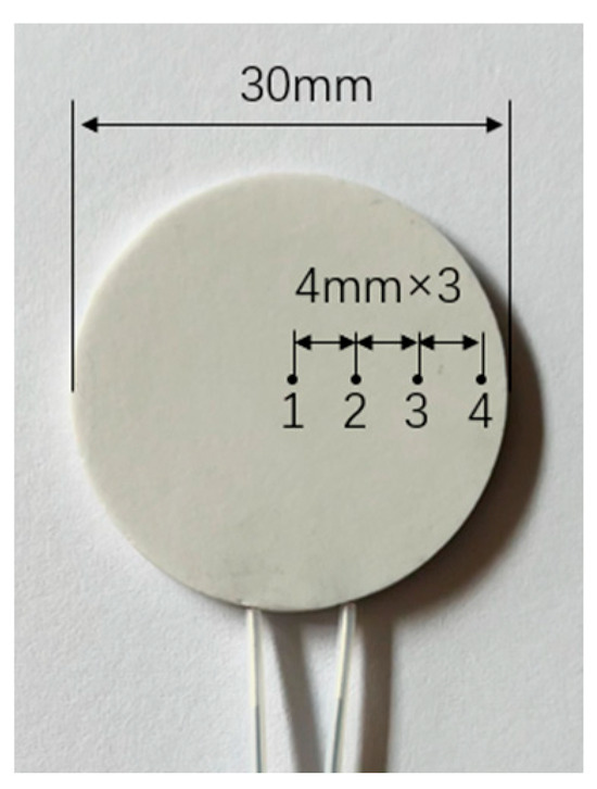 The heating element is replaced with a circular heating element that has a diameter of 30 mm and the temperature is measured at various points. The distribution of temperature measurement points is shown in Figure 10. Points 1, 2, 3, and 4 are equally distributed along the radius direction, spaced 4 mm apart, and point 1 is in the center of the heating element. Figure 11a,b show the measured surface temperature at different points as the heating element is cooling using the centrifugal fan and the focused ultrasonic radiator, respectively. It is seen that when the input voltage of the focused ultrasonic radiator is 30Vp-p and the speed of air flow is 3.3 m/s, the cooling effect of the focused ultrasonic radiator is focused in the focal region, while that of air flow spreads around.