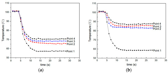 Figure 11. Measured surface temperature at different points as the heating element is cooling using the centrifugal fan and the focused ultrasonic radiator. (a) Cooling using the centrifugal fan. (b) Cooling using the focused ultrasonic radiator.