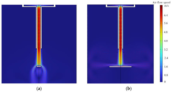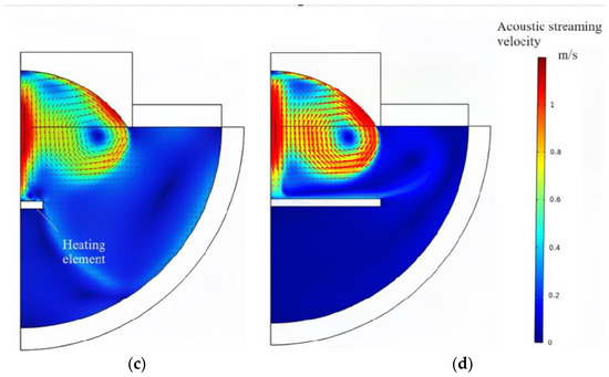 Figure 12. Simulated streaming fields. (a) Air flow streaming field when the diameter of the heating element is 5 mm. (b) Air flow streaming field when the diameter of the heating element is 30 mm. (c) Acoustic streaming field when the diameter of the heating element is 5 mm. (d) Acoustic streaming field when the diameter of the heating element is 30 mm.
