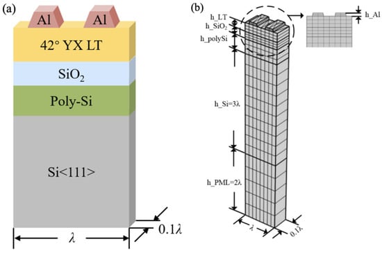 Three-dimensional FEM simulation results. (a) The Al electrode (100 nm)/42°Y-X LT (600 nm) structure; (b) The Al electrode (170 nm)/42°Y-X LT (800 nm)/Si structure.
