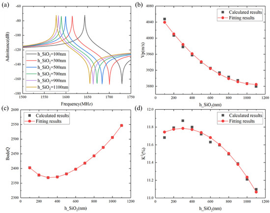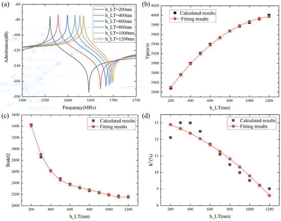 Calculated characteristic changes of the SH wave with different LiTaO3 thicknesses. (a) Admittance, (b) Vp, (c) Bode Q, and (d) K2. Black shapes denote the calculated data, and red shapes denote the fitting results.