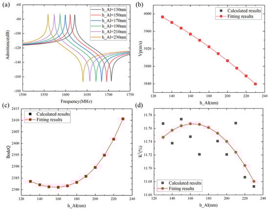 Calculated characteristic changes of the SH wave with different Al thicknesses. (a) Admittance, (b) Vp, (c) Bode Q, and (d) K2. Black shapes denote the calculated data, and red shapes denote the fitting results.