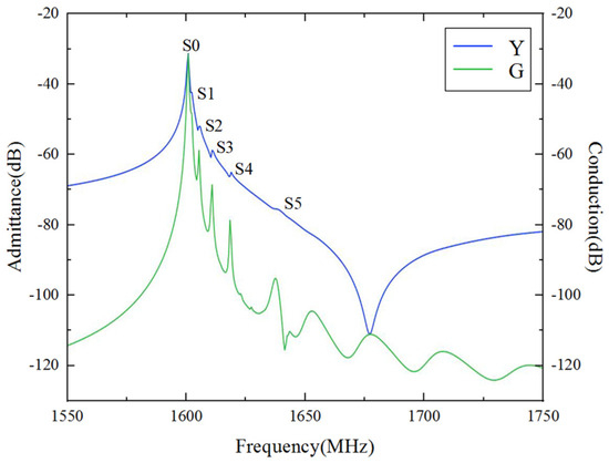 According to the above analysis, we found that the thickness of LiTaO3 has a significant impact on the Bode Q and K2 values, while the thicknesses of SiO2 and Al mainly affect the speed. In practical applications, a local finite element simulation cannot fully characterize the performance of the model in the aperture direction. In order to maintain generality, we used Al (170 nm)/42°Y-X LT (600 nm)/SiO2 (500 nm)/ploy-Si/Si to build a 3D periodic model with a gap length of 0.175λ, a dummy length of 0.5λ, a dummy width of 0.25λ, and an aperture length of 15λ. The finite element mesh of the 3D periodic model is made of free tetrahedral elements. In this analysis, a degree of freedom (DOF) of about 203,761 could be obtained. As shown in Figure 6, the result exhibited multiple higher-order harmonics between the resonance frequency and the anti-resonance frequency. Figure 7 shows the displacement of each higher-order transverse mode (S1, S2, S3, S4, and S5) along the aperture direction. The surface wave propagates back and forth many times in its resonant cavity while undergoing total reflection at the busbars and reflectors, thus causing the SAW to propagate laterally. The lateral resonant energy exists as higher harmonics near the main resonant frequency. These responses would cause a large amount of ripple in the passband of the SAW filter, affecting the loss and flatness of the device.