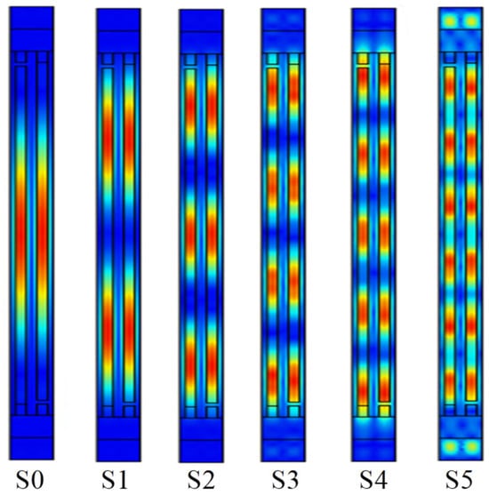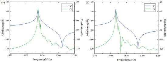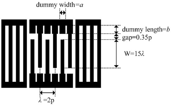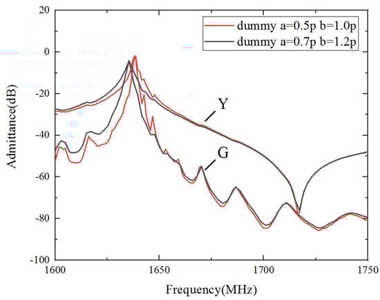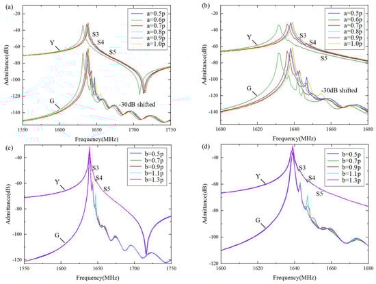 Figure 13a illustrates the effect of the dummy width (ranging from 0.5p to 1.0p (p = 0.5λ)) on the suppression of transverse wave modes. It can be seen clearly that configuring the dummy width and length is an efficient way to suppress the transverse wave modes, especially transverse modes S3 and S4. When the metallization ratio of the dummy changed from 0.5p to 1.0p, the amplitude of the transverse modes first decreased and then increased (Figure 13a). The optimal suppression of the transverse modes can be achieved at a = 0.7p. Figure 13b shows the effect of the dummy length, b, (ranging from 0.5p to 1.3p) on the suppression of the transverse wave modes. It is obvious that the dummy length only had a marked impact on the S4 mode, which showed a decreasing trend as the dummy length monotonically increased.