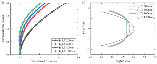 Calculated changes in dispersion/slowness curves for different LiTaO3 thicknesses. (a) Dispersion curves; (b) Slowness curves.