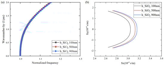 Calculated changes in dispersion/slowness curves for different SiO2 thicknesses. (a) Dispersion curves; (b) Slowness curves.