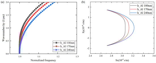 Calculated changes in dispersion/slowness curves for different Al thicknesses. (a) Dispersion curves; (b) Slowness curves.