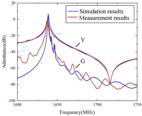 A SAW resonator on a multi-layered Al/42°Y-X LT/SiO2/poly-Si/Si structure was fabricated, with an Al electrode thickness of 100 nm, a LiTaO3 thickness of 600 nm, a SiO2 thickness of 500 nm, and a poly-Si thickness of 1000 nm. The IDTs consisted of 151 fingers and 20 fingers of reflectors on both sides. The gap length was 0.35p, the aperture length was 15λ, the dummy width was 0.5p (which is equal to the IDT width), and the dummy length was 1.0p. Figure 14 shows the measured (red lines) and calculated (blue lines) admittance Y11 curves of the SAW devices. The simulated results are in agreement with the experiment results for the fundamental wave mode. Notably, there was also a weak transverse high-order wave near the main resonant frequency.