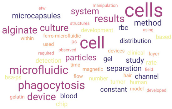 Figure 1 shows a word cloud prepared from the eleven abstracts published in the Special Issue, which suggests materials, the cells used in these studies, and principles for the cell manipulation. Efficiency, stability, and clinical use are important factors to apply microfluidic devices to practical biomedical applications, which are mentioned in the manuscripts. Here, the editor summarizes the materials and purposes in this Special Issue.