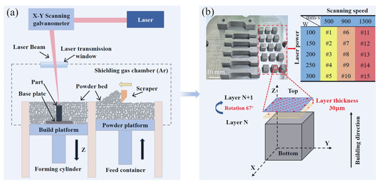 (a) Schematic illustration of the LPBF process, and (b) printed HEA samples and process parameters used.