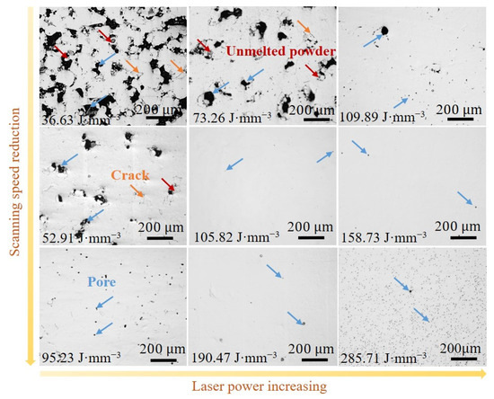Optical microscopic images of the LPBF-printed Fe30Mn50Co10Cr10 HEAs with different VEDs. The red, blue and orange arrows represent unmelt powder, pore and crack, respectively.