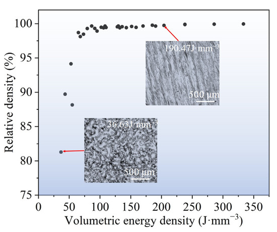 Relative density of as-printed Fe50Mn30Co10Cr10 HEA samples, and inserted image presents representative surface morphology of as-printed samples under different VEDs.