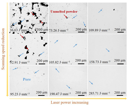 Optical microscopic images of the LPBF-printed Fe50Mn30Co10Cr10 HEA samples processed with different VEDs. The red and blue arrows represent unmelt powder and pore, respectively.