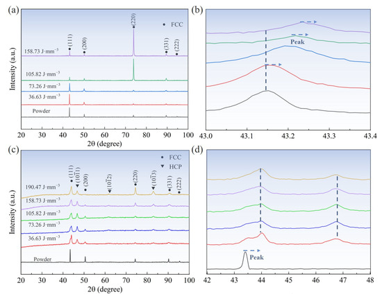 The Fe30Mn50Co10Cr10 HEA powders and their LPBF-printed samples exhibit a single-phase austenitic crystal structure (Figure 7a). The shift towards higher diffraction angles for peak (111), which changed from 43.15° to 43.25°, indicates a decrease in lattice parameters within the HEA as the VED increases (Figure 7b). This occurrence of a shifted diffraction angle can be attributed to the significant evaporation of Mn, with a lower boiling point compared to other elements in the FeMnCoCr HEA system, leading to a significantly lower elemental concentration at different volumetric energy densities. Additionally, due to its larger atomic diameter compared to Fe, Co, and Cr, the volatilization of Mn results in decreased lattice parameters within this HEA [21]. The diffraction pattern in Figure 7c exclusively demonstrates characteristic peaks corresponding to the austenitic crystal structure of Fe50Mn30Co10Cr10 powders, and the samples fabricated with different VEDs reveal the presence of martensite and austenite phase. Figure 7d demonstrates that the diffraction angles for peak (111) did not change as the VED increased except for the powder, and compared to the Fe30Mn50Co10Cr10 sample, its diffraction peak angle shows a more stabilized state at different VEDs. In summary, decreasing the Mn content from 50 to 30 at% transformed the lattice structure of the Fe80−xMnxCo10Cr10 HEA from FCC single-phase to FCC/HCP dual-phase. Gradual heat accumulation during the LPBF process results in a reduced temperature gradient and cooling rate in the melt pool, thereby promoting a thermotropic martensite phase transition. Notably, an increased intensity in the diffraction peak (220) was observed for the LPBF-printed Fe30Mn50Co10Cr10 and Fe50Mn30Co10Cr10 HEA samples when increasing the VED, indicating a preferential grain orientation within these samples.