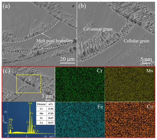The microstructure of the Fe30Mn50Co10Cr10 HEA sample printed using a volumetric energy density of 105.82 J·mm−3 reveals the presence of corrosion pits at the melt pool boundary, as depicted in Figure 8a,b. The accelerated corrosion rate observed at this boundary can be attributed to the existence of significant thermal stresses. Within the melt pool, columnar crystal structures grew along the heat flow direction at both the bottom boundary and inner area, while a cellular crystal structure was observed at the top region. Additionally, limited spherical pores were detected within the melt pool, which may have resulted from the volatilization of low-melting-point elements such as Mn during the LPBF process. Elemental mapping analysis depicted in Figure 8c demonstrates the uniform distribution of Fe, Mn, Co, and Cr elements within the Fe30Mn50Co10Cr10 HEA corresponding to locations where corrosion pits occurred at the melt pool boundary (highlighted by the yellow box), without any significant elemental segregation.