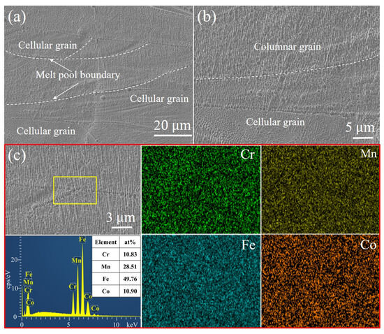 Microstructure and element distribution of the LPBF-printed Fe50Mn30Co10Cr10 HEA sample using a VED of 105.82 J·mm−3: (a) SEM image, (b) high-magnification image of (a), and (c) EDS mapping of element distribution.