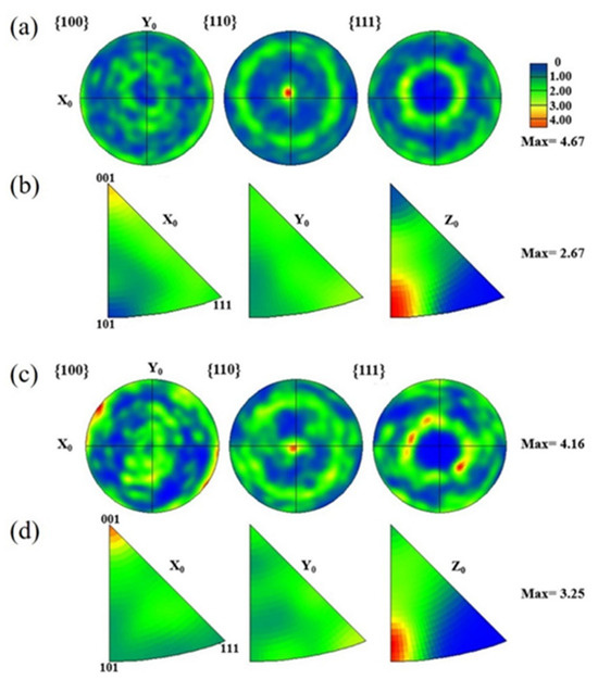 Grain orientation of LPBF-printed Fe80−xMnxCo10Cr10 HEAs: (a,b) polar figure and IPF of the Fe30Mn50Co10Cr10 alloy along the X-Y plane, respectively, and (c,d) polar figure and IPF of the Fe50Mn30Co10Cr10 alloy along the X-Y plane.