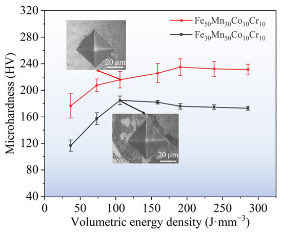 Microhardness of LPBF-printed Fe80−xMnxCo10Cr10 HEA samples under different VEDs.