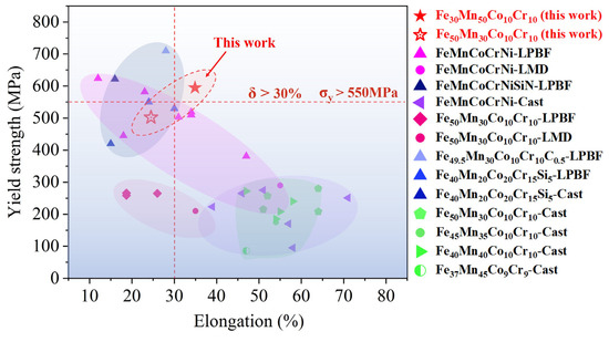 As shown in Figure 14, the LPBF-printed FeMnCoCr HEA systems exhibit an an exceptional combination of ductility and strength compared with previously reported additively manufactured FeMnCoCr HEAs [4,21,39,40,41,42,43,44,45,46,47,48,49,50] and cast FeMnCoCr-based HEAs [9,10,11,12,13,14,15,16,17,18,29,50,51,52,53,54,55]. This study shows that the elongation is over ~30% and the yield strength is over ~550 MPa. Meanwhile, the yield strength is significantly higher than the cast counterparts, and its ductility is comparable to pure and elementally added alloys.