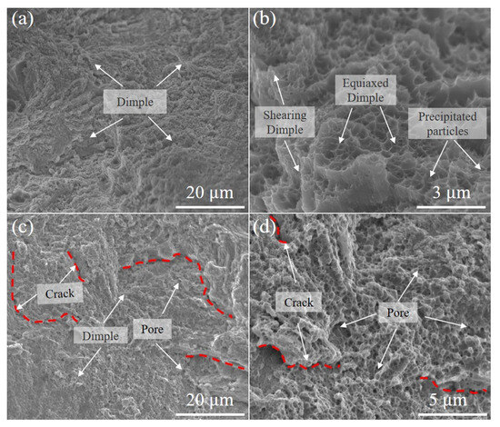 The fracture surface of the Fe30Mn50Co10Cr10 sample exhibits a multitude of equiaxial and shear dimples, indicating typical ductile fracture behavior (Figure 15a,b). Additionally, sporadic precipitated particles are observed at the center of these dimples, contributing to stress concentration and promoting micro-void expansion during tensile deformation, thereby influencing the mechanical properties of the HEAs. Figure 15c,d demonstrate that the Fe50Mn30Co10Cr10 sample displays a characteristic ductile fracture with numerous dimples containing pore and crack defects. This can be attributed to the presence of heterogeneous interfacial stresses between austenite and newly formed martensite, which induce the initiation and propagation of microcracks and pores within the dual-phase structure, consequently resulting in reduced ductility.
