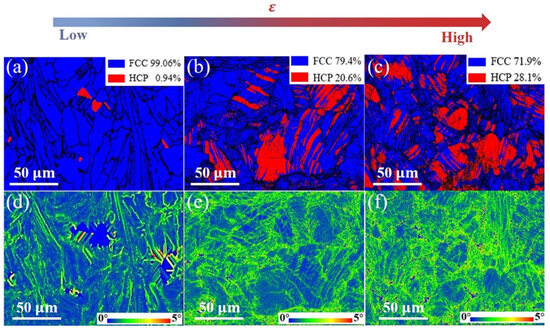EBSD results illustrating the microstructural evolution in the Fe50Mn30Co10Cr10 HEA sample under increasing tensile strains: (a–c) phase distributions at strains of 0%, 10%, and 20%, respectively, and (d–f) KAM maps at strains of 0%, 10%, and 20%, respectively.