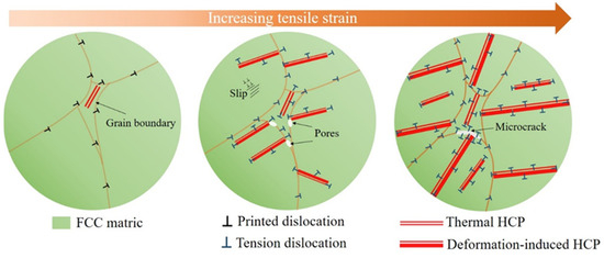 The phase transformations in the Fe50Mn30Co10Cr10 HEA play a dual influence mechanism on its mechanical properties, as illustrated in Figure 17. During early deformation, the phase transformation enhances the strain hardening rate and the mechanical strength of the HEA. However, during late deformation stages, the dual-phase deformation of martensite and austenite causes a local high degree of incompatibility, leading to blocked dislocation movement and increased dislocation density near the interphase, generating stress concentration [29]. This promotes the nucleation of pores and the expansion of cracks. The formation of a martensite phase transition is more brittle, making it susceptible to induced crack expansion and damaging the HEA’s ductility. The Fe50Mn30Co10Cr10 HEA has lower stacking fault energy than the Fe30Mn50Co10Cr10 HEA [16], allowing for the easy bundling of incomplete dislocations to ensure cross slip as the stacking fault energy decreases. The synergistic deformation of these two phases generates a beneficial dynamic strain–stress partitioning effect [58]. During the deformation process, the GNDs accumulated at the interface of the dual-phase region generate heterogeneous deformation-induced stresses [59], which further lead to the plastic instability of the alloy. Therefore, the martensitic transformation plays a dual role in strength and ductility; i.e., one is useful for tensile strength and initial ductile elongation, while the other is harmful for ductility fracture. This contradicts the general view that the martensite phase transition is beneficial for ductility [60].