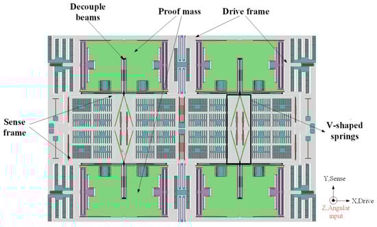 Figure 1 shows the schematic diagram of the mechanical design of our gyroscope. It is a symmetric structure with quad proof masses. Each proof mass is connected to the drive frame by four straight beams. Two masses on both sides are linked together with a U-shaped beam, which can provide a large range of displacement that is linear to the stress. Masses on different sides are connected with a balance leverage which can make sure masses move in opposite direction but at the same amplitude. The upper and lower masses are connected through V-shaped springs, and the other end of V-shaped springs are connected to the sense frame which is composed of the movable parts of comb capacitors. There are four anchors in left and right balance beams, respectively, and two anchors in the middle of this structure.