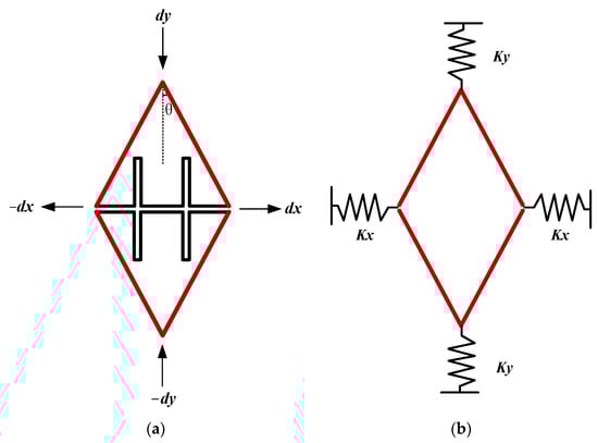 In Equation (7), Kx and Ky represent the stiffness coefficient of the beam connected to the V-shape springs. The angle θ should not be too big or too small. If θ was designed bigger than 25°, the amplification factor α would be smaller than 2, which cannot provide a satisfied effect on amplification. On the other hand, if θ was designed smaller than 10°, the stiffness of the X direction would be too small that the structure would be too fragile.