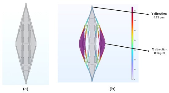 Figure 4. The results of steady simulation of mechanical motion amplifier. (a) The model of mechanical motion amplifier. (b) Displacement distribution of the Steady simulation.
