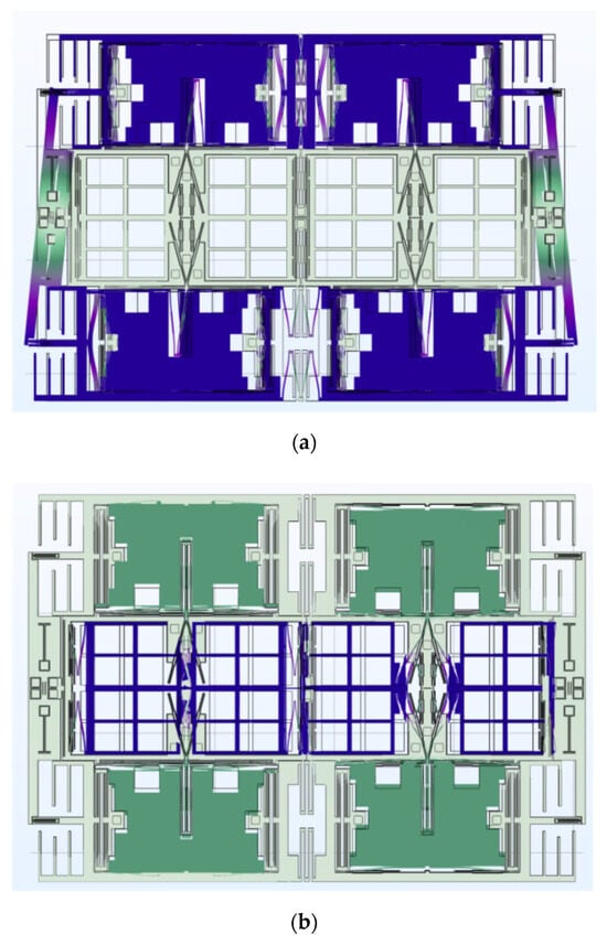 The beams and the proof masses have the same thickness of 60 μm, the device size is 4 mm × 5 mm. The drive beams are four-fold beams with a width of 12 μ m and length of 400 μm for each beam. The mechanical motion amplifier parameters are a width of 8 μm, length of 540 μm and angle of 15°, as discussed in Section 2.3. In the middle of the amplifier, the fold beam consists of a thinner and a thicker rectangle (Figure 4a). The thicker one’s width is 15 μm, and the length is 230 μm; this kind of composite rectangle design can precisely adjust the stiffness of the beams. This kind of design is used on almost all beams inside this QMG. More parameters about this gyroscope are as follows in Table 1.