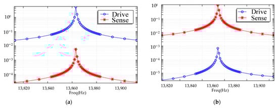 Figure 6. The results of harmonic response analysis. (a) Mechanical coupling from driving mode to sensing mode. (b) Mechanical coupling from sensing mode to driving mode.