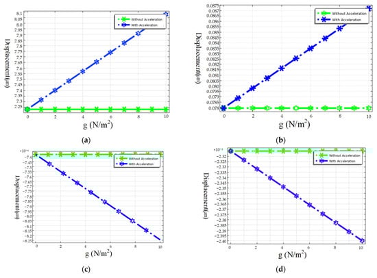 The influence of linear acceleration to this structure was also carried out in COMSOL as shown in Figure 7. First, the gyroscope was vibrating in the drive mode, which is its normal working state. Then, linear acceleration ranging from 1 g to 10 g was loaded onto X-axis and Y-axis, respectively. In Figure 7a,b, the relationship between X-axis/Y-axis acceleration and the drive part displacement is depicted. The rest of the pictures are similar but show the displacement of the sense part.