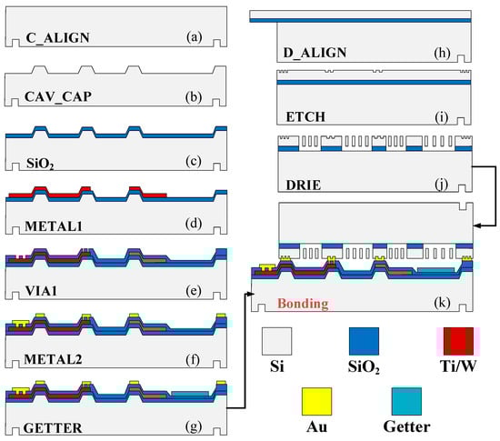 Figure 8 depicts the whole fabrication process of this gyroscope. First, the back alignment marks of the CAP wafer are defined by mask1 and the Deep RIE process (Figure 8a). Then, it used mask2 to define thermal SiO2 as a hard mask and etched 5 μm cavities using KOH wet etching (Figure 8b). After removing the hard mask, a 500 nm thermal oxide layer was grown as an insulator layer (Figure 8c). The first layer electrical connections are formed by metal sputtering Ti/W and wet etching of spare metal through the pattern of mask3 (Figure 8d). The insulator between the first and second metal layer is formed through PECVD and then used mask4 and SAMCO Rie to define the holes through two metal layers (Figure 8e). Finally, the bond ring and second metal layer are formed by metal sputtering and IBE with the pattern of mask5 (Figure 8f). The last step of the CAP wafer’s fabrication was depositing the getters (Figure 8g).