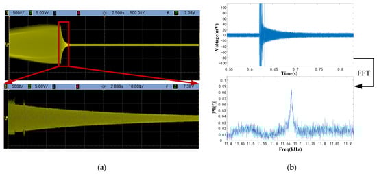 Figure 13. Results of ring-down test. (a) Ring-down test result on oscilloscopes, (b) ring-down data on MATLAB and FFT analysis of ring-down data.