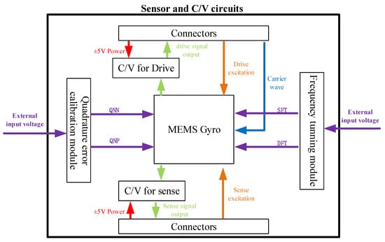 The overall gyroscope measurement and control circuits consisted of two parts. As shown in Figure 14, the first one included a MEMS gyroscope, a CV circuit, a quadrature calibration voltage module and a frequency tuning module. In Figure 15, the other one includes an FPGA control circuit, signal demodulation circuits, AD/DA circuits, excitation single-to-dual circuits, a carrier generation circuit and a voltage reference module. Among them, the design of the C/V circuit is shown in Figure 16. The C/V analog interface circuit consisted of charge amplification circuits, high-pass filter circuits, diode demodulation circuits, low-pass filter circuits and anti-phase difference amplifier circuits.