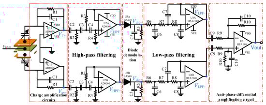 The C/V circuits in Figure 16 mean that the capacitance signal can change to a voltage signal. The charge amplification circuit can pick out the change in the charge change on capacitive plates and then turn it into a voltage signal. The high-pass filter circuit can filter out the carrier wave signal. Then, the diode demodulation circuit demodulates a useful signal from the carrier signal. Finally, two signals were sent to the differential amplification circuit to realize the elimination of common-mode signals and differential amplification of useful signals.