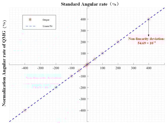 Using the circuits mentioned above, the Gyroscope characteristic tests were carried out. The first test was about the scale factor nonlinearity. A rate table is used to apply an angular rate to the QMG so that we can get its angular rate response. Figure 17 shows the measured angular rate response of the QMG. The input angular rate is from −400°/s to 400°/s. The X-axis data of Figure 17 are the angular rate from the rate table, which are used as a standard angular rate. The Y-axis data were the angular rate output of the QMG after normalization. The scale factor nonlinearity is 54.69 ppm in the full-scale range of ±400°/s.