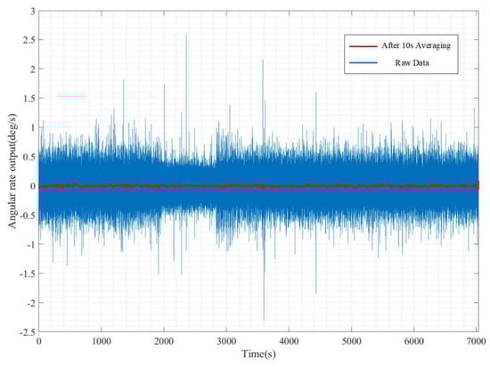 The zero rate output (ZRO) data are collected for 2 h at room temperature in order to calculate the bias stability of the QMG gyroscope system. The zero rate output of the QMG under constant temperature and pressure is shown in Figure 18. In Figure 18, the blue line is the raw data of the Gyroscope output, and the red line is the data being averaged for 10 s. As Figure 18 shows, the zero rate output data had a lot of undesired signals, which may have been induced by external vibration. By calculating the standard deviation of the averaging data, the bias stability was obtained to be 44.53°/h.