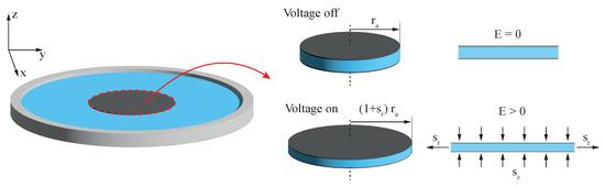 One of the commonly used approaches to calculate the deformation of DEAs is the Pelrine approach using linear elastic material properties [1,2,9]. As shown in Figure 2, it generally only accounts for the electrode area, neglecting forces stemming from the passive part, as illustrated in Figure 2.