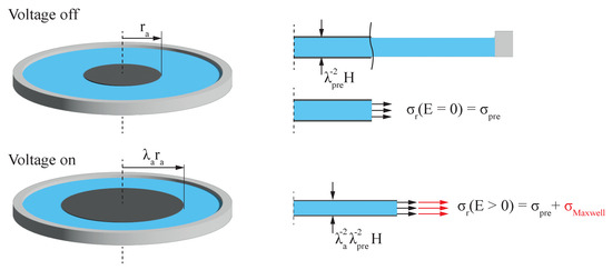 Here, R is the inital radius of the electrode and H is the initial thickness of the DE before pre-stretch and application of voltage. To reduce the complexity for the following calculations, the constant force is expressed as an equivalent constant pre-stretch in the passive area. Without an applied electric field, stretch ratio must be equivalent to applied pre-stretch . Therefore, setting in Equation (8) leads to