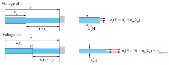 Here, is the stretch in the active region and is the resulting stretch in the passive part of the actuator. Mechanical stress is acting at the electrode edge and is, in contrast to the previous model presented in Section 2.2, dependent on electrode deformation. The results of the boundary condition of the dot actuator are illustrated in Figure 4. Due to the simplification that the electrode does not influence the material stiffness, it is possible to express through