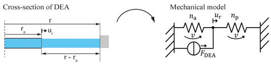 The lumped parameter model is derived by modeling a slice of the circular actuator with a network based on a mechanical structure for one-dimensional DEAs with a uniaxial strain state [21,22]. As shown in Figure 5, the active and the passive areas are described by their respective spring compliances and with velocity v and radial displacement .