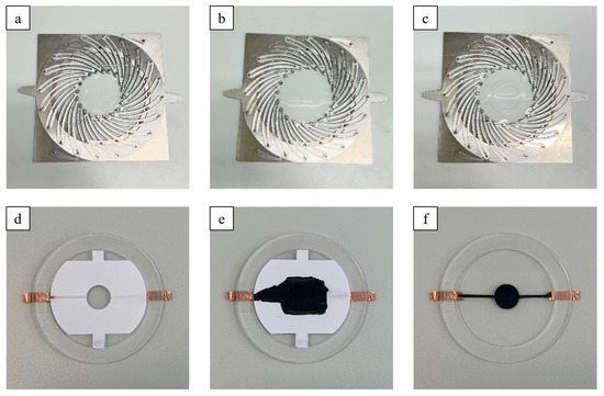Manufacturing steps of the actuators: (a) Fixation of the dielectric film to the pre-stretcher with magnets, (b) pre-stretching of the film, (c) bonding of the carrier frame with double-sided adhesive tape to fix pre-stretch, (d) mask for electrode application, (e) carbon grease applied to dielectric film and (f) finished actuator.