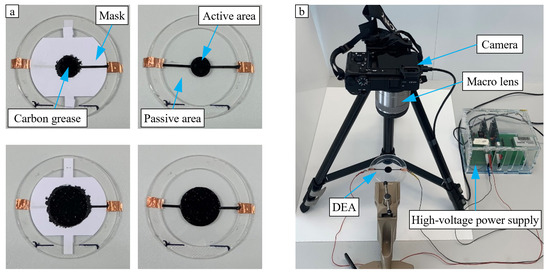 The influence of the active-to-passive ratio was investigated at three differently pre-stretched DEAs of Elastosil. Radial ratios of 25% and 50% applied on an Elastosil-based DEA are illustrated in Figure 7a as examples of coverage ratio variation during electro-mechanical characterization. Figure 7b shows the experimental set-up used to operate a DEA and record its electrically induced electrode deformation. The DEAs were driven with a constant voltage level of 4500 V using a Peta-pico-Voltron power supply [23]. In order to evaluate the electrode strain as a function of the coverage ratio, at each ratio, a 25 s video was recorded while the voltage was switched on and off. A compact camera (Sony α6400, Sony, Tokyo, Japan) with a macro lens (Sony SEL30M35, Sony, Tokyo, Japan) was used for video recordings at a speed of 100 frames per second. The distance between the lens and the observed electrode amounted to 12.5 cm. During the first 5 s of the video recording, the DEA was in a zero-voltage state to capture the initial electrode area. Constant voltage was then applied for 10 s, which lead to an equi-biaxial expansion of the electrode area, corresponding to a radial electrode strain. Subsequently, the voltage was switched off and the video recording continued for 10 s to track the recovery behavior of the electrode region.