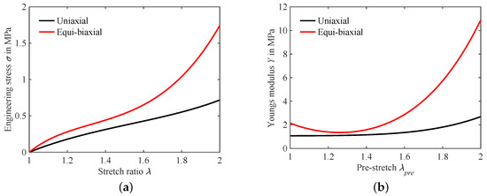 Hyperelastic behavior of DE material: (a) Stretch strain curves for uniaxial and equi-biaxial case and (b) influence of pre-stretch on Young’s modulus.